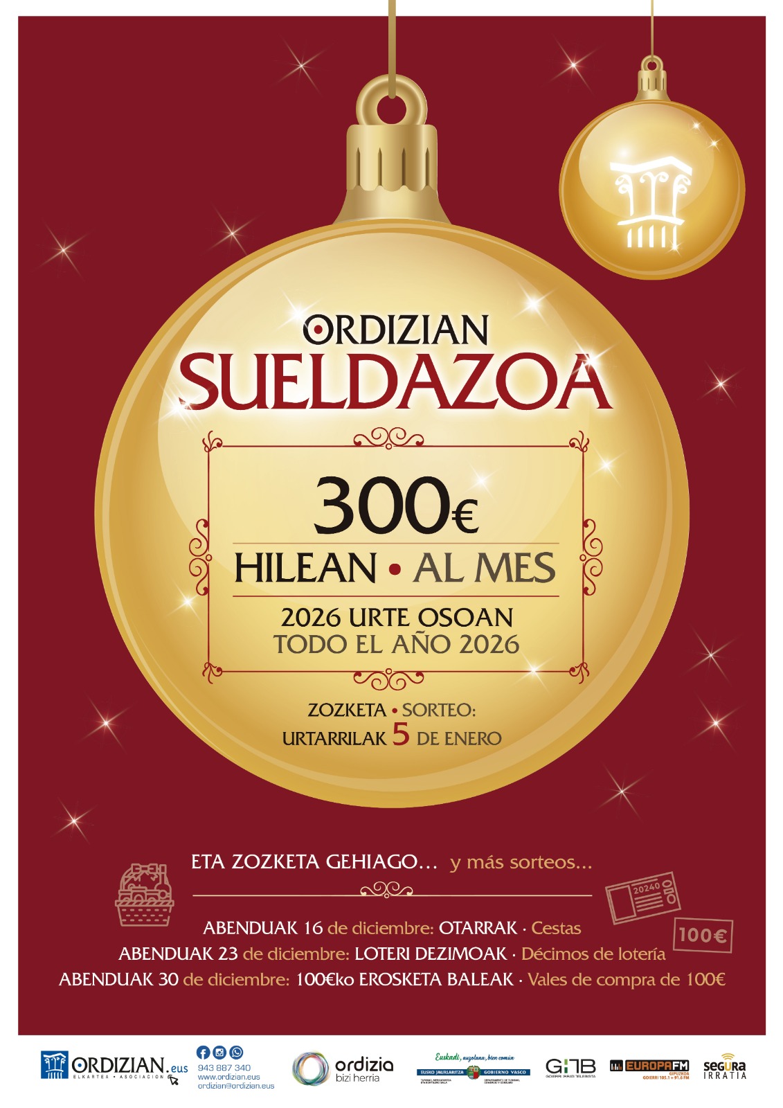 Elkarteak aukera ematen dizu ORDIZIAN SUPER SOLDATUA irabazteko, 300 € erosketa baleetan hilean, 2026. urte osoan, kanpainan parte hartzen duten establezimenduetan erosketak egiten dituzten pertsonen artean, abenduaren 11tik urtarrilaren 5era. Zozketa urtarrilaren 5ean egingo da, 13:15ean, Ordizian bulegoan.