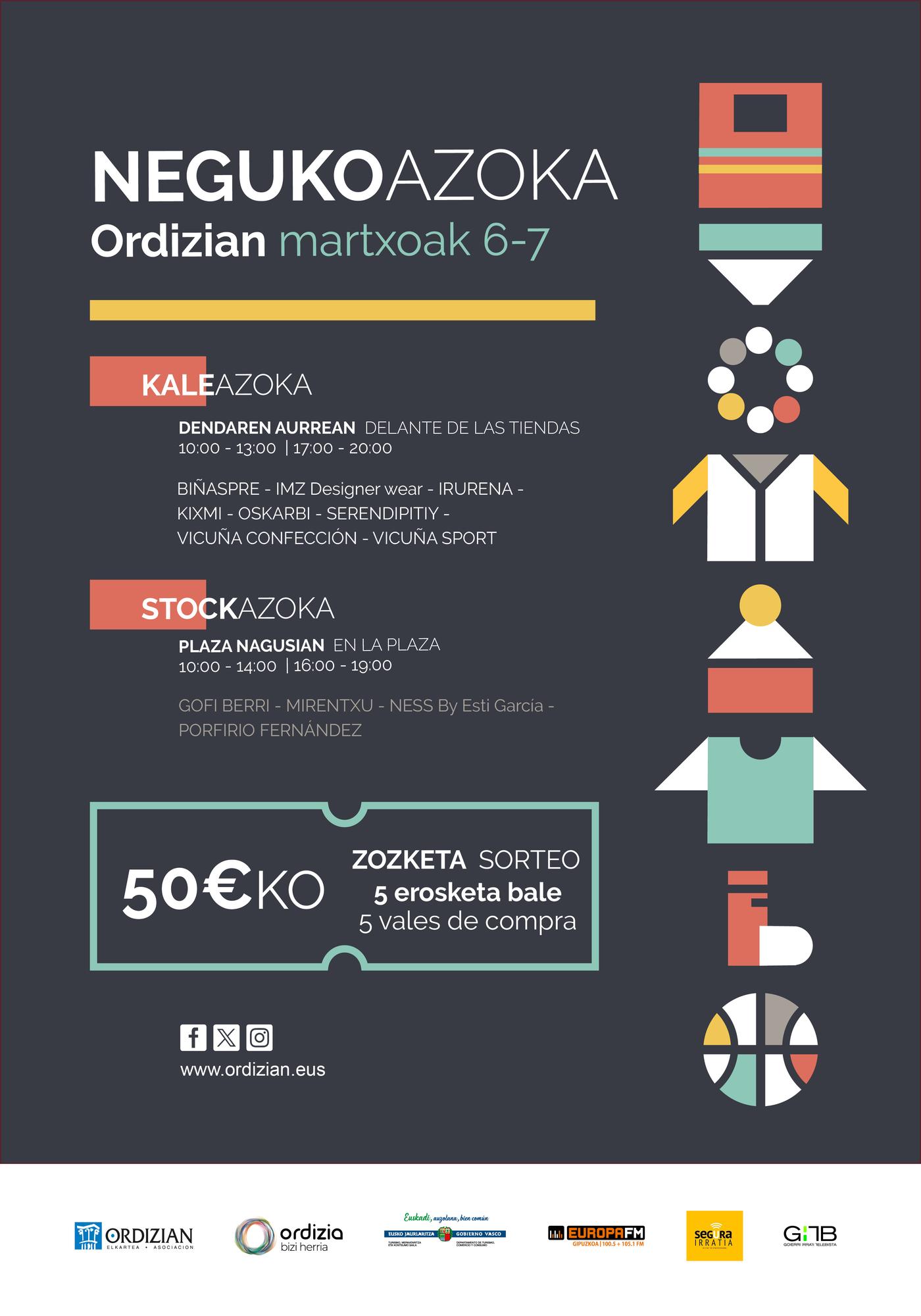 Ordizian merkataritza, ostalaritza eta zerbitzuak elkarteak, Ordiziako Udalarekin batera eta Eusko Jaurlaritzako Turismo, merkataritza eta kontsumo sailaren laguntzarekin, bertako komertzioaren Neguko Azoka antolatuko du martxoaren 6 eta 7an, non Stock gunea Plaza Nagusian izango dugun eta Kale-Azoka ere denden aurrealdean herriko kale desberdinetan produktuak aurkeztuz. Ekimen hau, beste behin ere, ostirala eta larunbataren zehar goiz eta arratsaldez burutuko da.